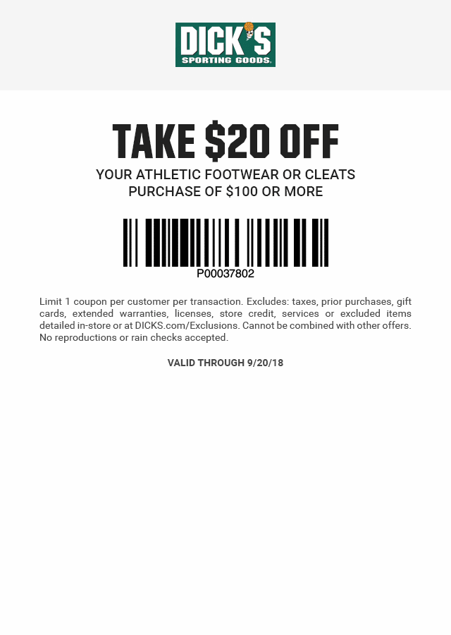 Dick's Sporting Goods Printable Coupons $10 Off $25 2022 Get extra percentage of with this Dick's Sporting Goods Promo Code 20 Dollar Off. Save up to 60% OFF with those Dick's Sporting Goods coupons and discounts for December 2018. Get the best deals. Expires: Aug 14, 2022 6 used Last used 6 days ago. $20 OFF.