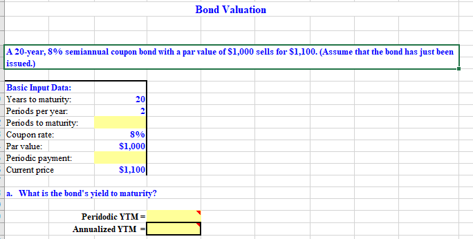 How to calculate yield to maturity in Excel (Free Excel Template) It cannot change over the life of the bond. The coupon rate is 6%. But as payment is done twice a year, the coupon rate for a period will be 6%/2 = 3%. So, pmt will be $1000 x 3% = $30. PV = Present value of the bond. It is the amount that you spend to buy a bond. So, it is negative in the RATE function. FV = Future value of the bond. It is ...